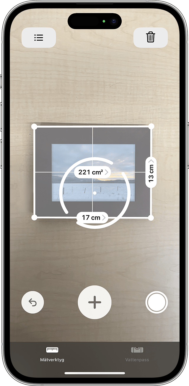 Om din enhet upptäcker att föremålet du mäter är en kvadrat eller en rektangel, placeras automatiskt en mätruta runt föremålet. Tryck på knappen Lägg till så visas måtten för föremålets bredd och längd. Flytta enheten något så visas föremålets beräknade yta.