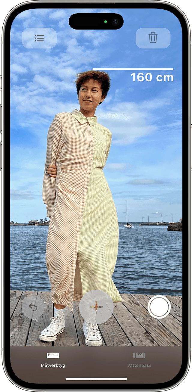 När appen Mätverktyg upptäcker en person i sökaren mäter den automatiskt längden från marken till överst på huvudet, hatten eller håret. Du kan trycka på slutarknappen för att ta en bild på personen med längdmåttet. Därefter kan du använda Märkning